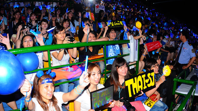 Nhóm nhạc Hàn Quốc Super Junior thu hút các fan từ các tỉnh thành cũng như các nước lân cận tụ tập về sân vận động Bình Dương để xem thần tượng biểu diễn - Ảnh: T.T.D.