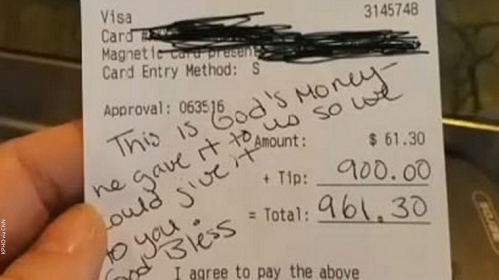 Không chỉ tip đến 900 USD, một khách hàng ở Mỹ còn gửi lời chúc phúc đến nhân viên phục vụ. Ảnh: CNN.